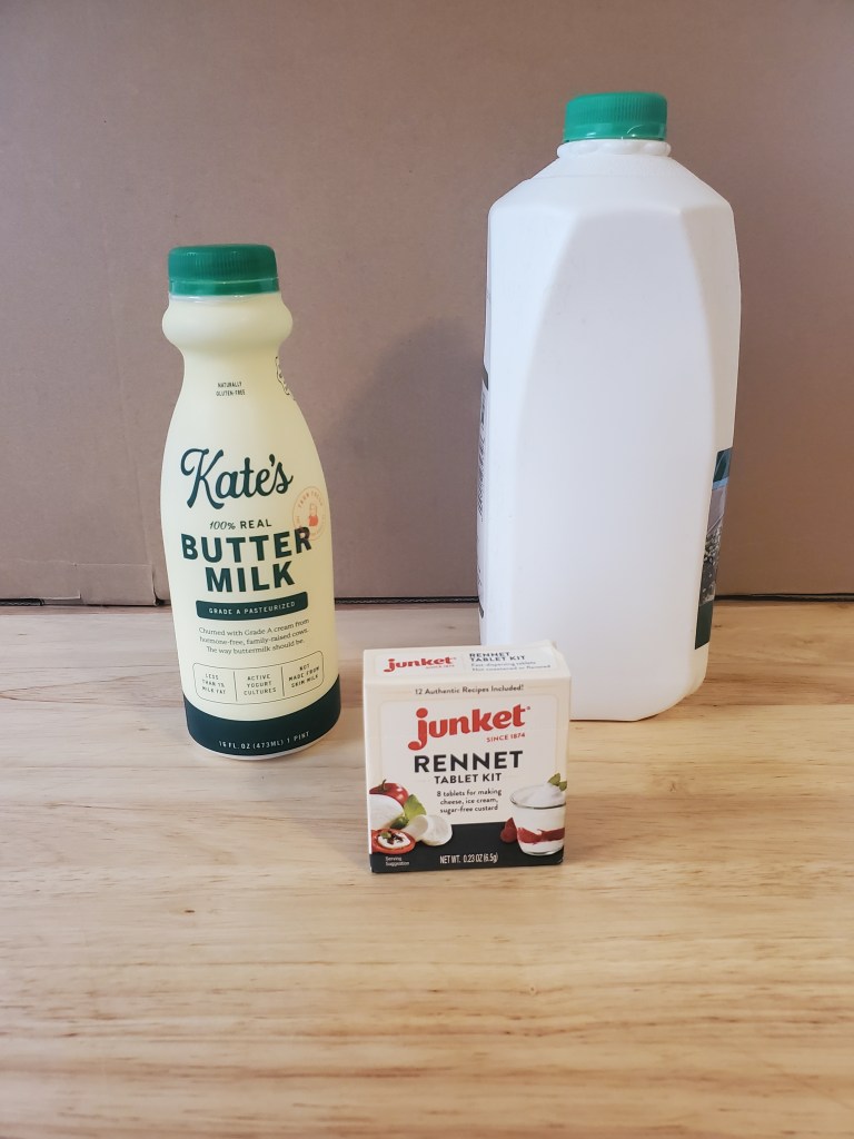 Heat Skim milk, buttermilk to 85 degrees then add 1/4 Rennet tablet